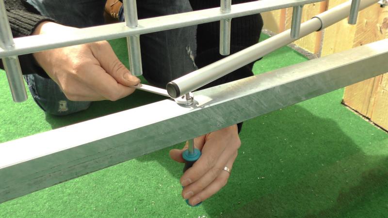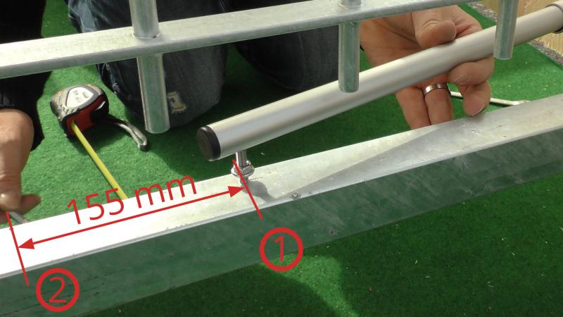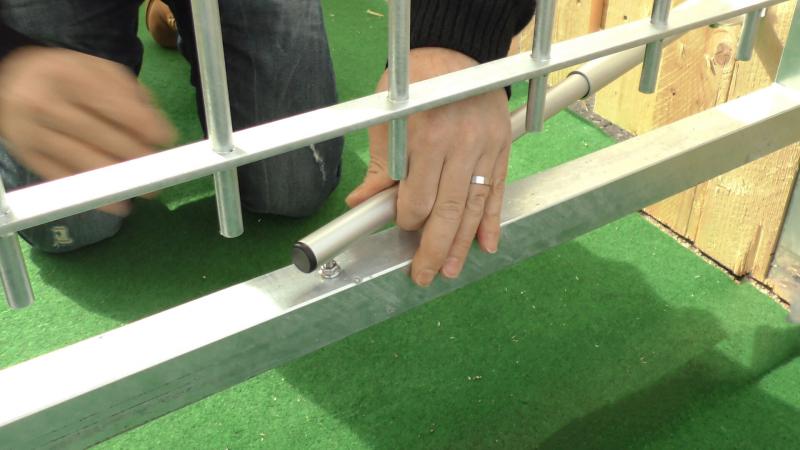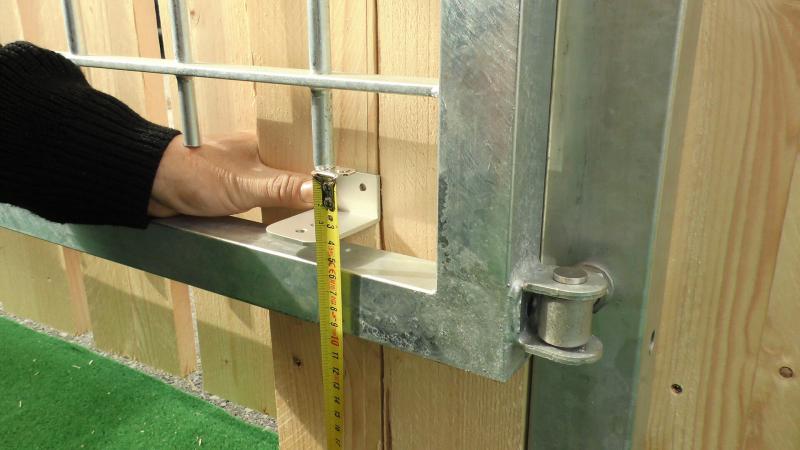 Now, put the gate back to its original position. For mounting the gate closer the thicker end of the closer must be put into bracket 1. The slimmer end must be mounted into the drilling as done in step 5.
