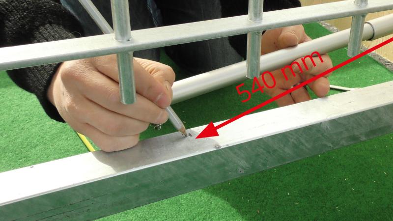 To verify the mounting positions fix bracket 1 provisionally at the position as measured before and install the gate closer in the mounting hole as chosen before. Close the gate and mark the position of the bolt on the frame of the gate (mark 1). Then open the gate and mark again the position of the bolt on the frame (mark 2).
