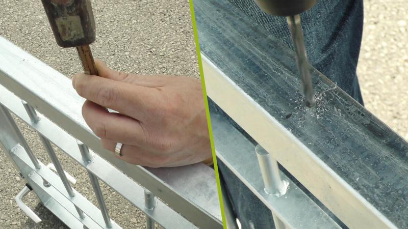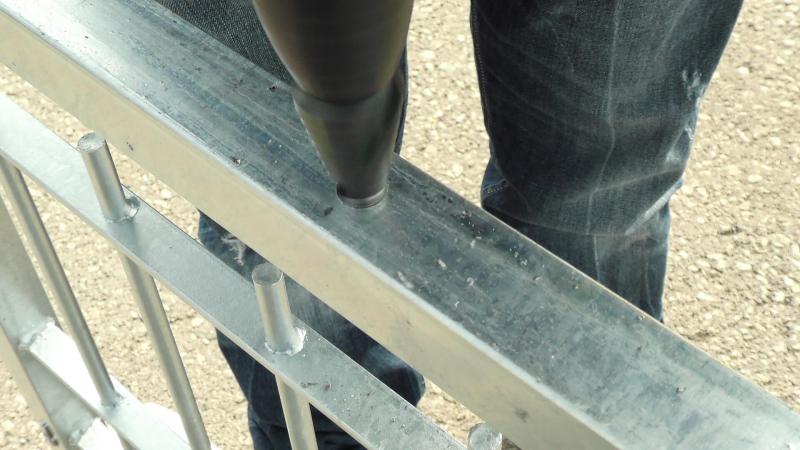 Having measured the distance correctly, unhook the gate and transfer the mounting position to the bottom of the frame. Then drill the frame entirely using a 6 mm metal drill. Make sure that the drilling is done straight in line. As a next step, widen the drilling hole at the bottom up to 12 – 14 mm using a cone drill. This is necessary, so that the 10 mm socket wrench can be placed.