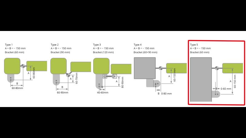 If the distance between the two marks amounts to about 155 mm, the position of the bracket is optimal. If the distance is a bit less, increase distance B a bit. If the distance is bigger than 155 mm, decrease distance B or choose another mounting hole.