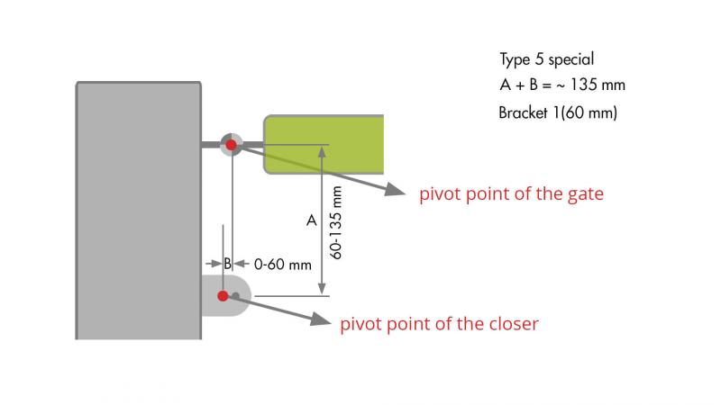 The sum of the two distances A and B in this special case should not exceed 135 mm, and also should not be less than 125 mm either. However, if the sum of the distances is bigger than 135 mm, the gate can only be opened a little less than 90° at worst.