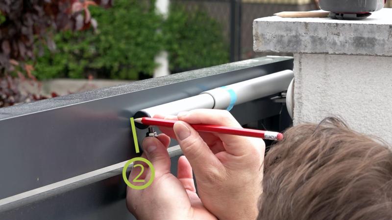 To verify the mounting positions fix bracket 1 provisionally at the position as measured before and install the gate closer in the mounting hole as chosen before. Close the gate and mark the position of the bolt on the frame of the gate (mark 1). Then open the gate and mark again the position of the bolt on the frame (mark 2).