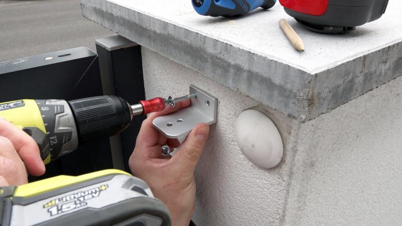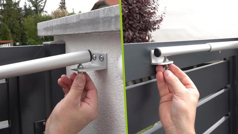 First, you need to determine the position of the garden gate closer. It can be positioned at the top of the gate, in the middle or at the bottom. It is important that it is mounted levelled! As well, the two brackets (bracket 1 and bracket 2) need to find sufficient hold on the wall and on the gate respectively. The larger bracket (bracket 1) is to be mounted on the wall. The smaller bracket (bracket 2) will be mounted on the gate!