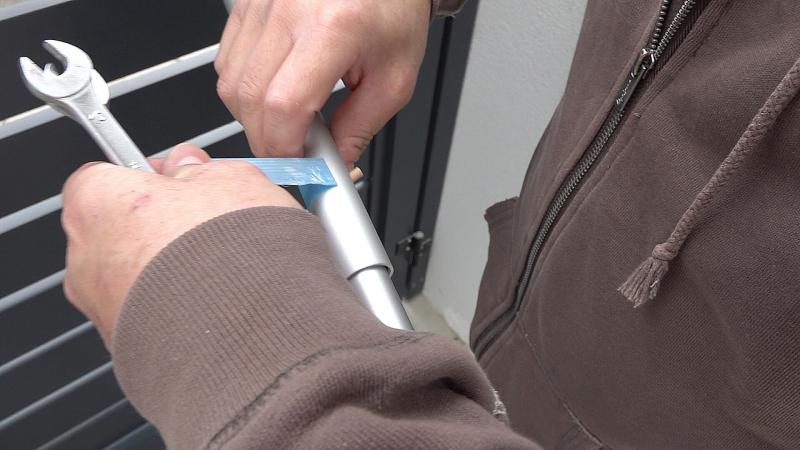 WARNING: The garden gate closer is preloaded! The preloading safety should not be removed before insertion! Due to preloading the threaded rods of the gate closer are skewed. They will adjust during assembly.