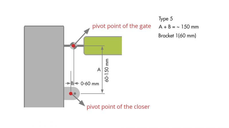 The sum of the two distances A and B in this mounting type should not exceed 150 mm, and also should not be less than 140 mm either. However, if the sum of the distances is bigger than 150 mm, the gate can only be opened a little less than 90° at worst.