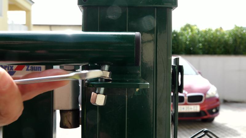 Finally, the garden gate closer is fixed using the cap nuts. Therefore, screw on and tighten the cap nuts using the locknuts. In this step the nuts should be tightened in such a fashion, so that the threaded rods are straightened and stand in right angles to the mounting bracket.